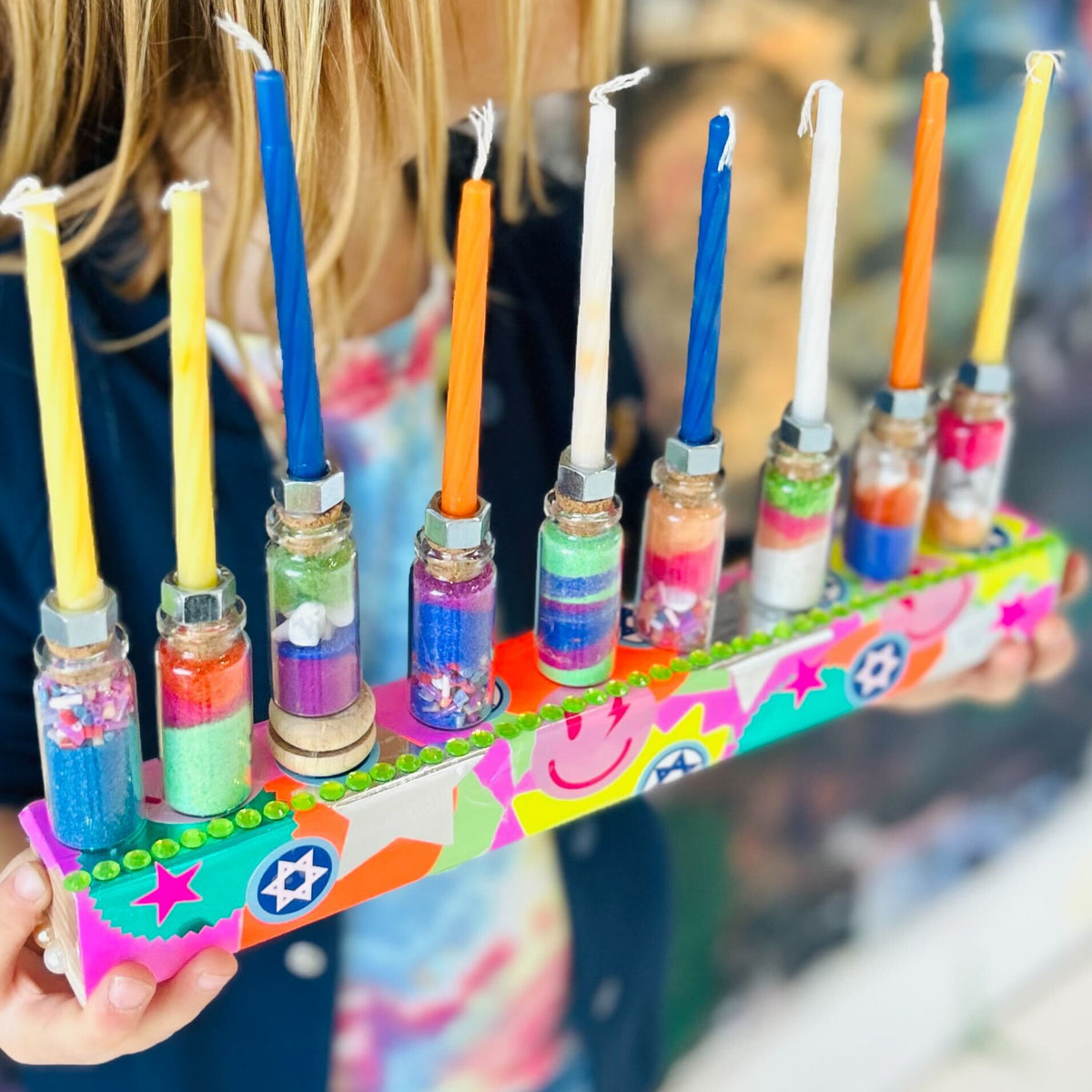 This kit includes all the base materials for your own Hanukkiah - wooden base, glass bottles, and bolts (which hold the candles). Decorate your base, fill your bottles, glue on the bolts, and enjoy your Hanukkiah!